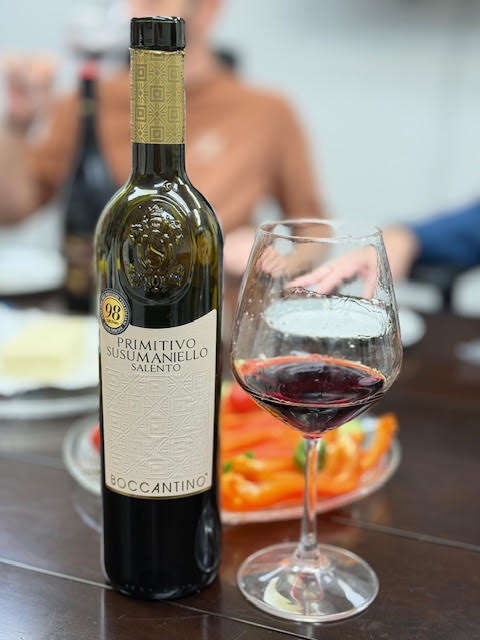 מאותו הקונצרן SCHENK, והפעם מיקב נוסף בשם Boccantino טעמנו Primitivo Susumaniello המורכב מ- 50% פרימיטיבו, 50% סוסומנילו. זהו יין אדום חצי יבש המורכב ממענבי הפרימיטיבו והסוסומנילו הגדלים בפוליה – מחוז מולדתם. היין עבר יישון של שלושה חודשים בחבית ומלא בטעם גם בזכות שני זני הענבים המיוחדים מהם הוא עשוי שמעניקים טעמי פרי אדום כהה כמו שזיף בשל, דובדבן שחור ופירות יער. שזיפים מיובשים, אוכמניות ופלפל שחור באף. עוצמה וחמימות רבה בחך. באף, ארומות של אוכמניות, דובדבן בשל ועשבי תיבול ים תיכוניים עם נגיעות עדינות של תבלינים. החך מלא וחלק, הכולל פירות כהים בשלים, טאנינים רכים וסיומת חמה ומתמשכת. סוסומאניילו הוא ענב עתיק, כמעט נשכח, יליד פוליה, המביא ניחוח פרחוני ורעננות לפרימיטיבו הפירותי והעמוק. תערובת בוקנטינו חוגגת את השותפות הייחודית הזו, ויוצרת יין שהוא גם נועז וגם מאוזן באלגנטיות. הגוף של היין מלא ובעל עושר המאפיין את איזור סלנטו של פוליה. הוא מוגדר כיין יום יומי כיפי במיוחד, אשר לא מצריך ארוחה כבדה ומאפשר התענגות עליו גם ללא אוכל לידו כלל.